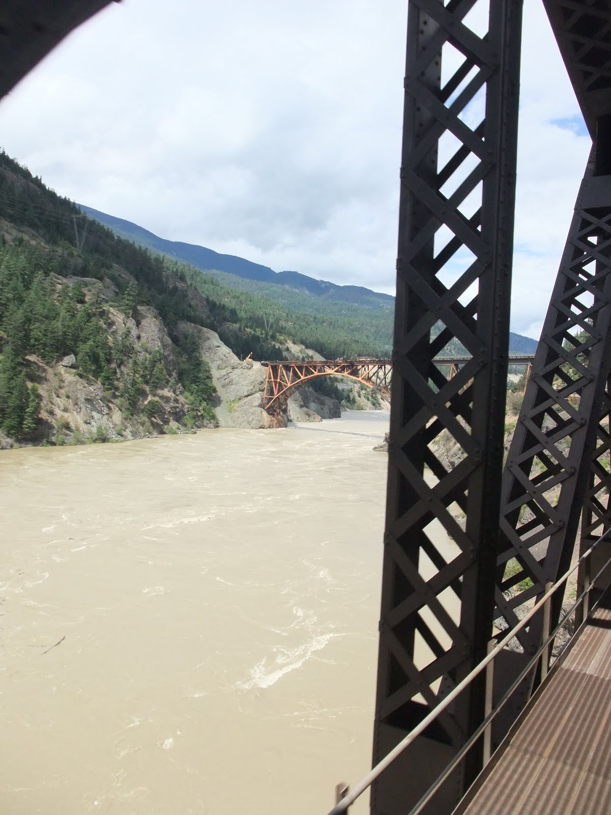 This is the Fraser River, which is much muddier than the Thompson. The two rivers converge in the town of Lytton. We are approaching a bridge that had burned only a short time earlier. The river was very high during our journey and would peak the next day.